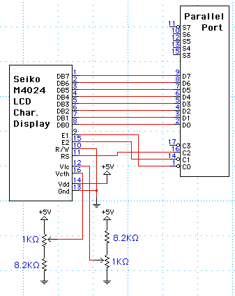 This page describes how I interfaced a Seiko M4024 LCD Character Display to both a standard PC parallel port and the GPIO of the soekris net4801 router. SpecificationsHardware InterfaceThe M4024 uses either a 4bit or 8bit data transfers and has 3 control lines (4 if you want to read as well as write). I run the display in 4bit mode. 7 pins are needed for output to the display. The display also needs 5V DC power, Vlc (LCD voltage, about 0V to 1V to control the contrast), and Vcth (LED backlight voltage, about 3.9 to 4.2V to control brightness). PC Parallel PortThe standard PC parallel port contains 12 output pins and 5 input pins. 7 output pins are used for the display. 5V power is drawn from the PC power supply.
